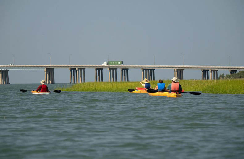 A group of kayakers paddles toward the Chesapeake Bay Bridge-Tunnel at the tip of the Delmarva Peninsula in Virginia.