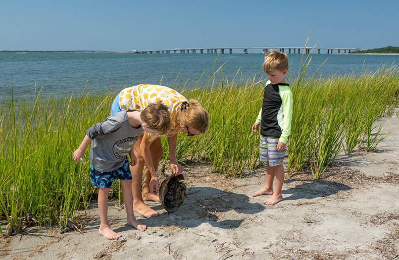 Tour guide Emma Karlok shows a horseshoe crab shell to brothers Wade and Brody Squire on Raccoon Island, Va.